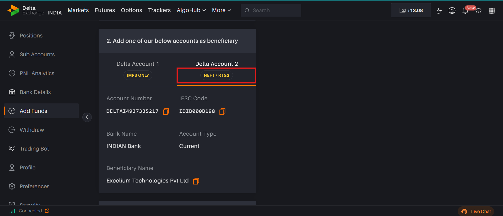 - Ensure that you transfer funds to the designated NEFT/RTGS account shown on the Delta Exchange deposit page.